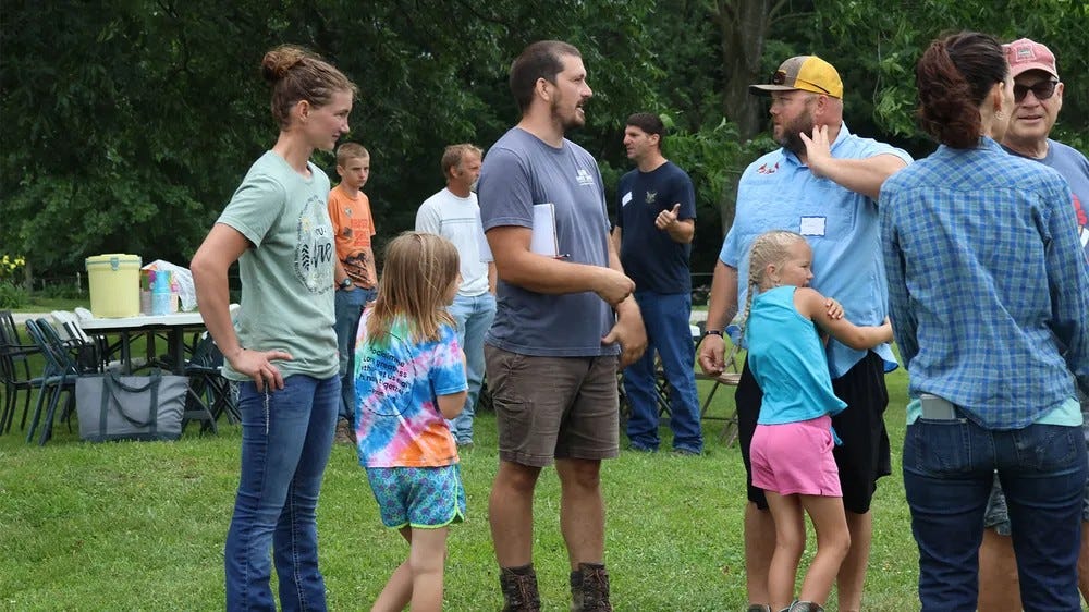 Communities are all around us in every facet of life, from the people and worldwide lifeways we interact in, down to the microbes beneath our feet interacting with nutrients and plants to feed out soils and world. For myself it is easy to forget about doing my part and being connected, it is easy to hermit out at the end of a day with farm work, endless electronic distractions and many other excuses to avoid connection. But for ourselves, families, communities and ultimately the world to find balance, it takes a bunch of individuals doing little things selflessly to build up the greater community around us. I struggle to get involved locally for fear of letting people I know and love down as I know with my full schedule I will drop the ball somewhere, but I think I will have to challenge myself to be more involved. In the last year we were able to open our farm gates multiple times to groups of farmers from the Midwest and the Wye Valley Grassland group. We hope to continue this in 2026 with a pasture walk with the Greenhills grazing group and a field day talking about Native forages with Ozark Native Seed LLC. Events like that have helped me realize the greatest benefits of opening up your farm, home, or heart is the opportunity to grow through critiquing and working with others. As a raging introvert sitting back and feeling safe is a great way to never grow not only on an individual level but as a part of a community. If I did what my inner monolog told me I would hide on the farm and avoid everyone, but I know I will never grow if I do that. I often think back to my childhood going out to my Great Grandmother Redman’s on Sunday afternoons. We always had cousins, Aunts, Uncles and others showing up to eat a meal and seeing what needed done around the farm. Some would keep an eye on us kids some would tend to the cattle or garden, and all of us would sit back and listen to Grandma Lucille tell us where we need to get our butts in line. We had our family unit to keep us accountable. As Americans and in the western world we value our personal identity so greatly that we spend loads of time “working on ourselves” to the point we forget our role in our community groups. I am extremely guilty of this, I often dive down rabbit holes trying to learn as much about soil and grazing as I can to the point I am buried in a book and not playing with my kids as a dad should. I want to pass knowledge and a desire to learn onto them but I need to slow down and be present. I think that is the biggest factor I see missing in community is just being there, not with an agenda or a checklist to accomplish for a resume’ or virtue signaling but just be present and see what the people around you need, that’s where community starts.